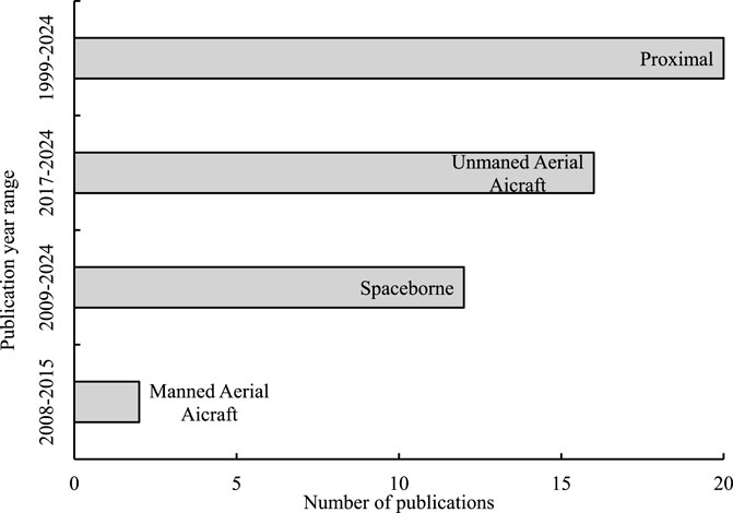 Hyperspectral sensors feature various narrow bands, enabling acquisition of detailed and more nuanced vegetation and crop characteristics of the canopy such as health and pest infestation (Saif et al., 2023). This study noted 20 publications that utilized proximal hyperspectral remote sensing devices such as the Analytical Spectral Devices (ASD) to assess vegetation and crop BGB (Luo et al., 2017; Marino and Alvino, 2015; Sun et al., 2020; Suarez et al., 2020) (Figure 4). For instance, Streit et al. (2019) used the Fourier Transform Infrared (FTIR) spectrometer to determine how winter faba bean genotype roots systems can influence its AGB. The findings of the study indicated the significant value of vegetation BGB estimation in predicting AGB, providing insights into the strong positive relationship between the two variables. Furthermore, given the well-established relationship between vegetation health and its BGB in literature, spectral characteristics including optimized vegetation indices of the canopy can potentially accurately map subsurface biomass as reported by Wright et al. (2004), Sun et al. (2020), Middleton et al. (2013).