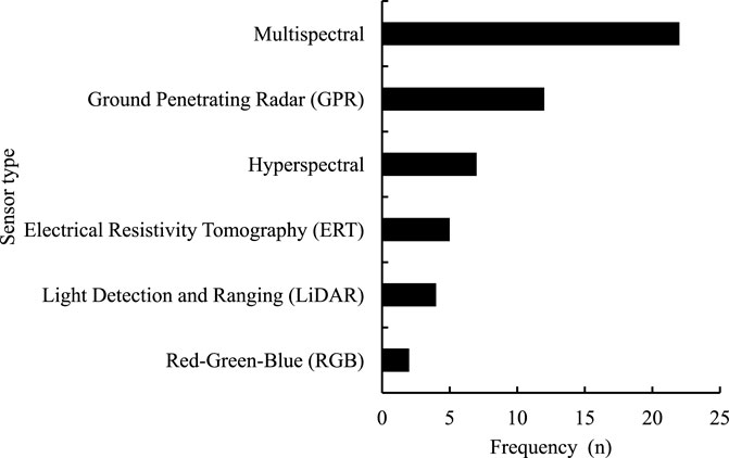 Ground Penetrating Radar (GPR) system is the second most frequently used remote sensing technology for estimating vegetation and crop BGB after multispectral sensors (Figure 4). The GPR system is a proximal remote sensing approach used for detecting and localization of vegetation BGB up to 30 m belowground (Liu et al., 2018). The 30-m coverage of the GPR system allows for the detection of most vegetation BGB, as the majority of plants typically do not extend deeper than 30 m belowground (Agbona et al., 2021). Ground penetrating radar systems provide a 3-Dimesional (3D) full resolution subsurface architecture using bow-tie antennas emitting a frequency ranging from 10 MHz to 2.6 GHz (Agbona et al., 2021). The GPR system can be integrated with the antenna, allowing easy deploy and use in confined spaces such as small-scale farming systems and dense forests (Barton and Montagu, 2004). The antenna emits and receives radar waves and works closely with the GPR unit that processes the signals and displays the data (Butnor et al., 2003). Alternatively, the GPR unit can be mounted on an aerial vehicle or alternatively operated on the ground while the antenna is positioned separately (Cui et al., 2011). This separation provides more flexibility, especially for large-scale surveys and challenging terrains such as dense natural forests (Cui et al., 2012). However, Guo et al. (2013) emphasized the importance of ensuring correct positioning of the antenna to the GPR system to effectively send and receive electromagnetic waves from the soil. The GPR systems heavily depends on soil permittivity such as conductivity and dielectric constants, which is determined by calculating the Time Domain Reflectometry (TDR) as explained by Hruska et al. (1999). The TDR verifies the quality of signal paths, essential for determining soil permittivity in allowing the GPR frequency to directly detect subsurface biomass (Isaac and Anglaaere, 2013).