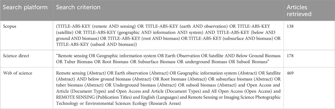 Relevant publications were retrieved from Google Scholar to identify potential key terms for formulating the search string, as suggested by Aromataris and Riitano (2014). Thereafter, the following string was formulated: “Remote sensing” OR “Geographic information system” OR “Earth Observation” OR “Satellite” AND “Below Ground Biomass” OR “Tuber Biomass” OR “Root Biomass” OR “Subsurface Biomass” OR “Underground Biomass” OR “Subsoil Biomass”. A comprehensive literature database was then conducted using the search string on the Web of Science (WOS), Scopus, and Science Direct scientific databases on 19 August 2024 (Table 1). These scientific databases were chosen based on pervious literature reviews conducted on similar topics (Ndlovu et al., 2024; Sibiya et al., 2025). The literature search was limited to the tittles, abstracts, and keywords of the publications without restricting the year of publication and geographic location. Furthermore, literature reviews were excluded in the literature search, and only publications written in English were considered for practicality and to avoid language discrepancies.