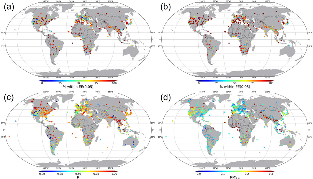 In terms of AOD validation (Figures 1c,d), the correlation coefficient (R) for AOD exceeds 0.75 over major AERONET sites. Lower R values observed over the western United States and Europe are statistical artifacts, due to generally low AOD values in these regions (e.g., the maximum AOD at the Tucson AERONET site in the western United States in 2022 was less than 0.5). The consistently low Root Mean Square Error (RMSE) values in the United States and Europe further support this explanation.