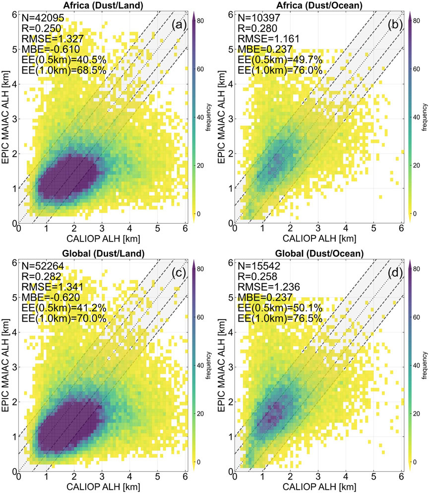 Figure 2. Comparison of MAIAC EPIC ALH with the CALIOP dataset for dust aerosols over (a) land and (b) ocean over Africa only, and (c) land and (d) ocean for global from 1 July 2015 to 31 December 2023. The colors represent the number of collocated comparison points within each 0.1 km range.