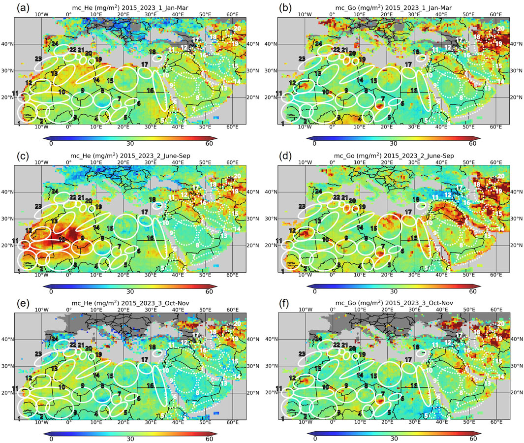 Figure 3. Distribution of the column mass concentration (mg/m2) of hematite (left) and goethite (right) per season [(a,b) January, February, March, (c,d) June, July, August, September, (e,f) October, November] MAIAC AOD443 > 0.4 over Sahara–Sahel–Middle East obtained from 1 July 2015 to 31 December 2023. The white solid circled sources are numbered as follows: 1, Senegal River Basin; 2, Aoukar depression; 3, upper Niger River Basin; 4, Lake Chad; 5,river drainage basin of the Ennedi and Ouaddaï highlands; 6, Mourdi depression; 7, Bodélé depression; 8, Grand Erg of Bilma; 9, river drainage basin of the Aïir; 10, Erg El Djouf; 11, Sebkhet te-n-Dgâmcha; 12, Tiris Zemmour region; 13, Grand Erg Occidental; 14, Grand Erg Oriental; 15, Libyan Desert; 16, Nile River Basin; 17, Qattarah depression; 18, Mesaoria plain in Cyprus; 19, Chott el Jerïd; 20, Chott Melrhir; 21, Chott el Hodma; 22, Chott ech Chergui; 23, Morocco coastal plains; and 24, Andalusia in Spain. The white dashed circled sources are numbered as follows: 4, Danakil Desert of Ethiopia; 5, Lake Tana of Ethiopia; 6, northeast Sudan; 7, Hadramawt region; 8, Empty Quarter; 9, highlands of Saudi Arabia; 10, Jordan River Basin of Jordan; 11, Mesopotamia; 12, Urumia Lake of Iran; 13, coastal desert of Iran; 14, Hamun-i-Mashkel; 15, Dasht-e Lut Desert of Iran; 16, Dasht-e Kavir Desert of Iran; 17, Qobustan in Azerbaijan; 18, Atrek delta of Turkmenistan; 19, Turan plain of Uzbekistan; and 20, Aral Sea.