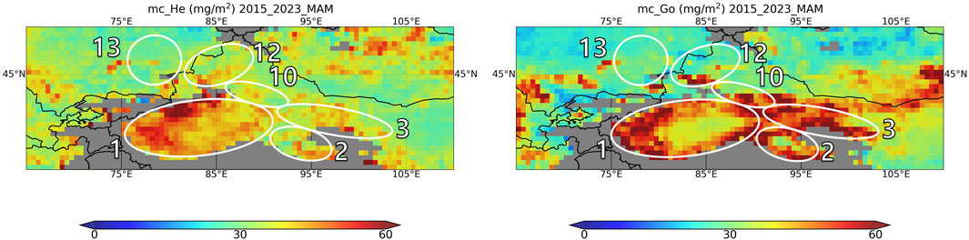 Figure 4. Distribution of the column mass concentration (mg/m2) of hematite (left) and goethite (right) per season (March, April, May) MAIAC AOD443 > 0.4 over Taklamakan desert obtained from 1 July 2015 to 31 December 2023. The white solid circled sources are numbered as follows: 1, Tarim Pendi; 2, Qaidam Pendi; 3, Hexi corridor in Gansu Province; 10, Turpan Pendi; 12, Junggar Pendi; and 13, Balkhash-Alakol depression.