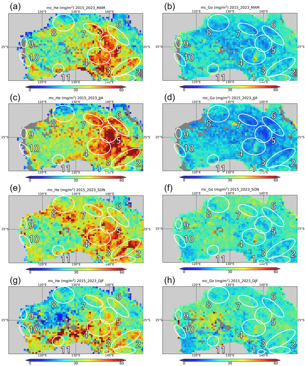Figure 5. Distribution of the column mass concentration (mg/m2) of hematite (left) and goethite (right) per season (a,b) March, April, May, (c,d) June, July, August, (e,f) September, October, November, (g,h) December, January, February) MAIAC AOD443 > 0.4 over Australia obtained from 1 July 2015 to 31 December 2023. The white solid circled sources are numbered as follows: 1, Victorian Big Desert; 2, Riverina; 3, Barwon-Darling Basin; 4, Lake Eyre Basin; 5, Simpson Desert; 6, lee side of Great Dividing Range; 7, Barkly Tableland; 8, Kimberley Plateau; 9, North West Cape; 10, Darling Front Range; and 11, Nullarbor Plain.