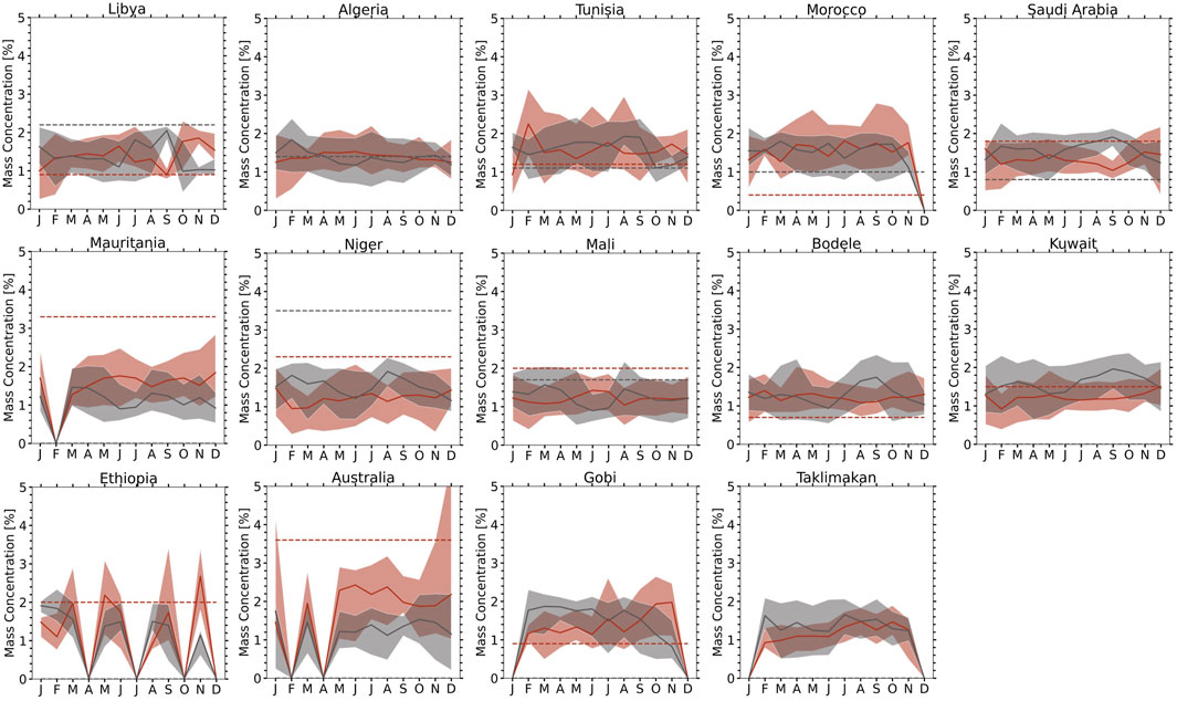 Figure 6. Monthly variations (5th, 50th, and 95th percentiles) of hematite (red shading) and goethite (gray shading) mass fraction (wt.%) calculated from MAIAC EPIC at each site for 2018. The x-axis represents each month from January to December. Solid lines at the centers of shaded areas indicate median values for hematite (red) and goethite (black). Each site represents an area of ±1° for the MAIAC EPIC data (pixels with AOD at 443 nm > 0.6) except for Australia (±3°). Dashed lines indicate hematite (red) and goethite (black) mass fraction with ±10% uncertainty (Di Biagio et al., 2019). For the Algeria site, the two dashed lines coincide (Di Biagio et al., 2019). The missing dashed lines for goethite at Mauritania, Bodélé, Ethiopia, Kuwait, the Gobi, Arizona, and Australia indicate the goethite mass fraction was zero. Di Biagio et al. (2019) did not provide data for the Taklamakan site.