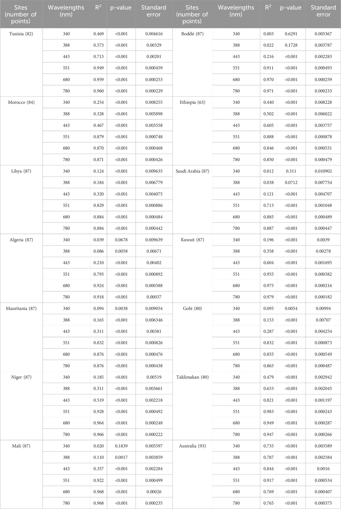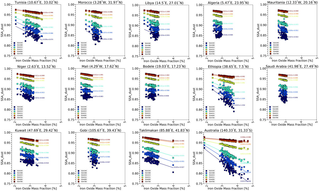 Table 1. Coefficients of determination (R2), p-values, and standard errors for the linear regression between Single Scattering Albedo (SSA) and the mass fraction of iron oxides (MCFe-ox%) at different wavelengths (340–780 nm) for major dust sources in Figure 7.