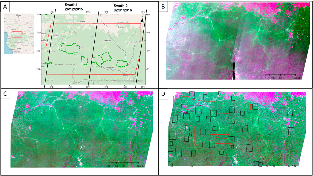 Using Google Earth Engine, we inspected the Sentinel 2 archive available during the dry season (low cloud cover) and downloaded 27 tiles spread over 2 swaths, that is 14 tiles for the first swath acquired on 26/12/2015 and 13 tiles for the second swath acquired a week later, on 02/01/2016. We selected these products at the L1C level, which corresponds to top-of-atmosphere (TOA) reflectance of orthorectified images. This choice allows for in-house correction of atmospheric effects and bidirectional reflectance distribution function (BRDF), both of which significantly influence image reflectance, especially in forested environments. First, the Overland image processing software (developed by Airbus Defense and Space; (Doxani et al., 2023; Feret and Barbier, 2025) was used for atmospheric correction and noise reduction. Second, bidirectional effects were corrected using the Ross-thick Li-sparse model (Lucht et al., 2002) calibrated for tropical forests. Specifically, we used a set of model coefficients fitted using S2 images of tropical forests after Overland correction, using a dataset of 183 granule-level images distributed over 6 acquisition orbits and 37 swath-level acquisitions (Ploton et al. in prep).