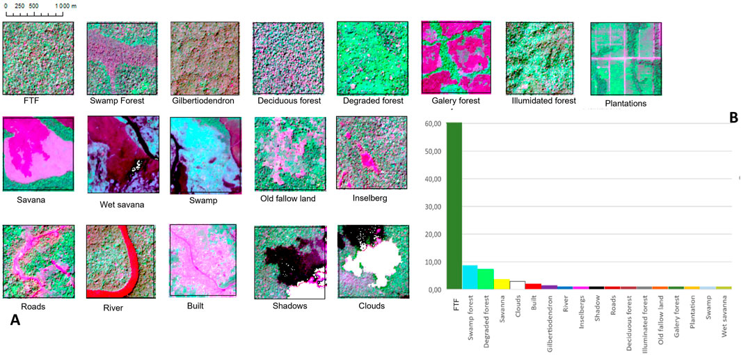 Figure 2. (A) Illustrative caption of the 18 landcover classes and (B) distribution of classes in terms of percentage of training polygons per class. FTF (Terra Firme forests).