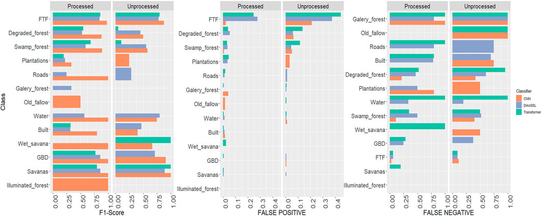 The analysis of False Positive Rates (FPR) and False Negative Rates (FNR) per class (Figure 3) provides further insights into classification errors. Majority classes such as terra firme forest, degraded forest, and swamp forest were frequently over-predicted by both transformer models, as reflected in their high FPRs, on both preprocessed and unprocessed images. In contrast, the CNN demonstrated consistently low FPRs, reflecting higher precision. The ViT, struggled to correctly identify swamp and degraded forests, with FNRs of 0.35 and 0.52 respectively, further highlighting its limitations under challenging conditions.
