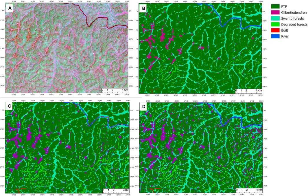 Distinguishing between formations such as swamp forests in peatlands and riparian zones (edaphic forests), open-canopy forests (e.g., Marantaceae forests), monodominant stands (e.g., Gilbertiodendron or Okoumé), regenerating or degraded forests, and open ecosystems like savannas and Miombo woodlands is essential for refining classification schemes. Achieving this level of detail requires the integration of very high-resolution (VHR) imagery with field-based data to improve both the understanding and modeling of forest dynamics.