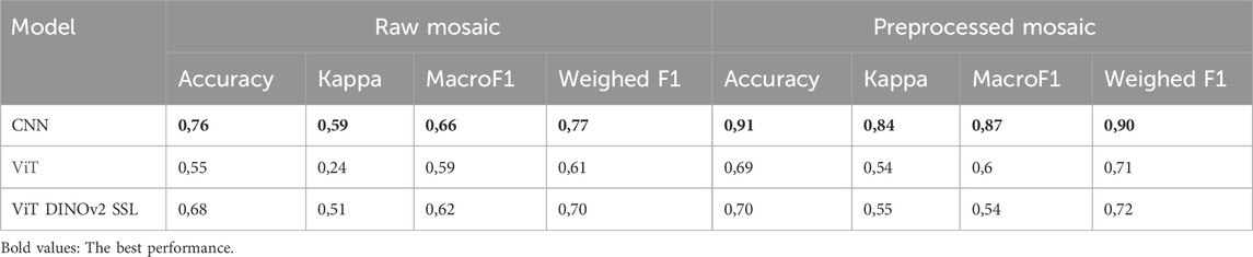 When applied to unprocessed (raw) images, the performance of all models declined, confirming the positive effect of pre-processing. The CNN experienced a notable drop, with a Kappa of 0.59 and accuracy of 0.76, although it still outperformed the other two models. The Transformer model showed particularly poor performance on raw images, with a Kappa of just 0.24 suggesting significant generalization issues. The ViT DINOv2 SSL model was more robust, achieving a moderate Kappa of 0.51 on raw images, slightly lower than that obtained on processed images (0.55).