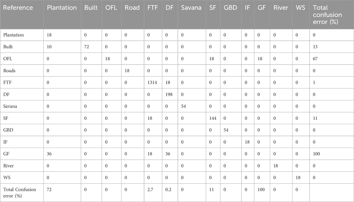 Table 2. Confusion matrix for the CNN model on processed image. OFL (Old Fallow Land), FTF (Terra Firma Forest), SF (Swamp Forest), GBD (Gilbertiodendron), IF (Illuminated Forest), GF (Gallery Forest), DF (Degraded Forest) and WS (Wet savana).