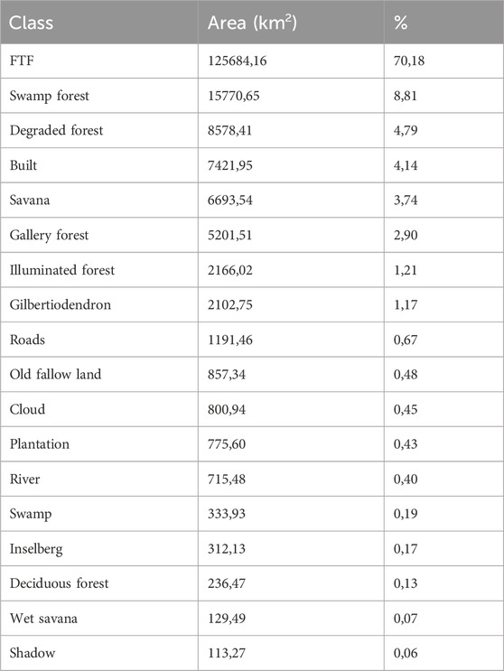 Terra Firme Forest, which is a heterogen class, is the predominant vegetation type in the region, covering 70.18% of the study area (Table 3). It is followed by Swamp Forests, which represent 8.81% of the landscape. These swamp forests are well captured by the model, as illustrated in Figure 5, and are especially concentrated in the southern portion of the study area (Figure 4). Degraded Forests are mostly found near roads and built-up areas and account for 4.79% of the total area.