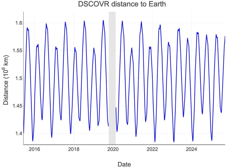 Figure 1. Distance between Earth and DSCOVR (in 106 km). Shadowed area shows the spacecraft’s safe hold period (from 27 June 2019, to 19 February 2020).