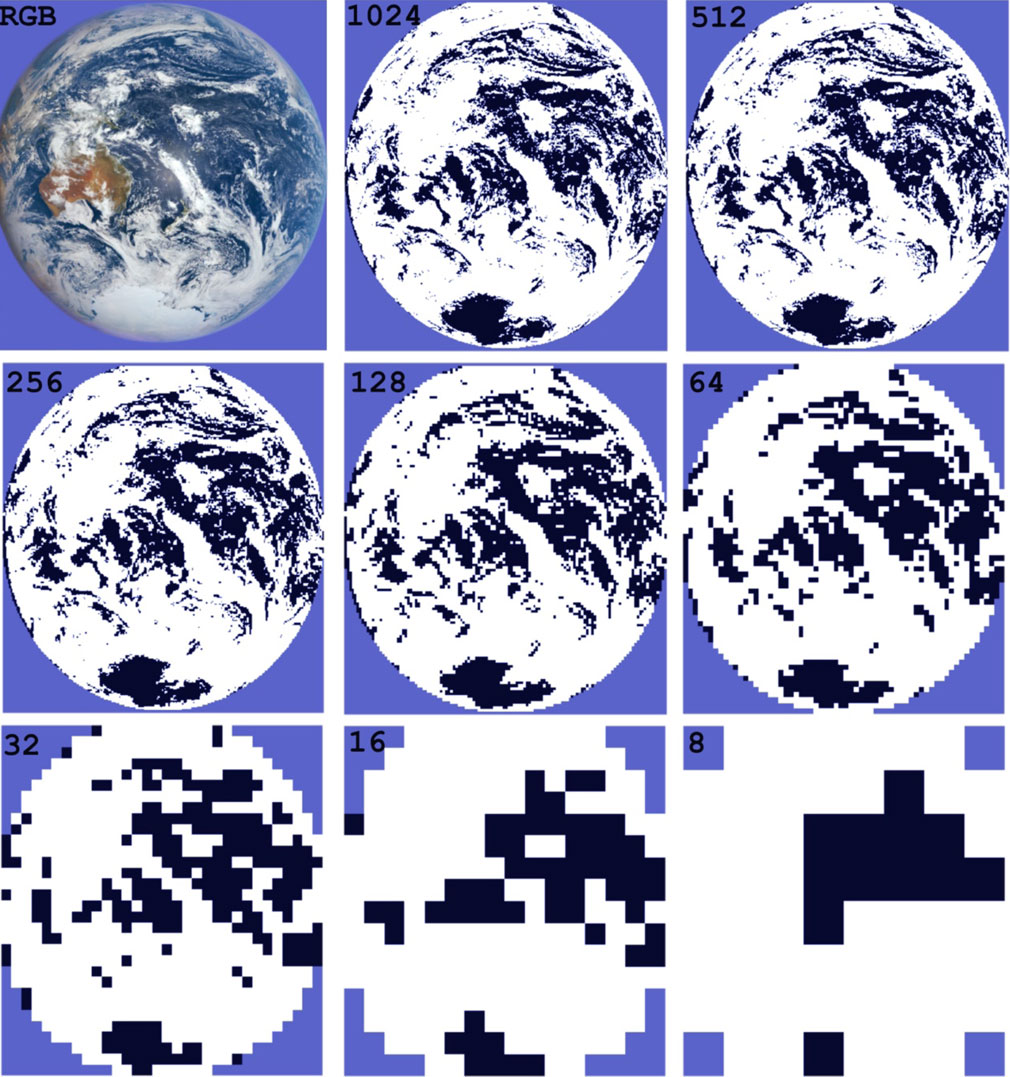 Figure 2. Binary cloud mask heatmap for down-sampled resolutions using the 50% threshold rule from 1,024 px to 8 px. Pixel size is approximately 10 km at native resolution and 1,600 km at 8 px.