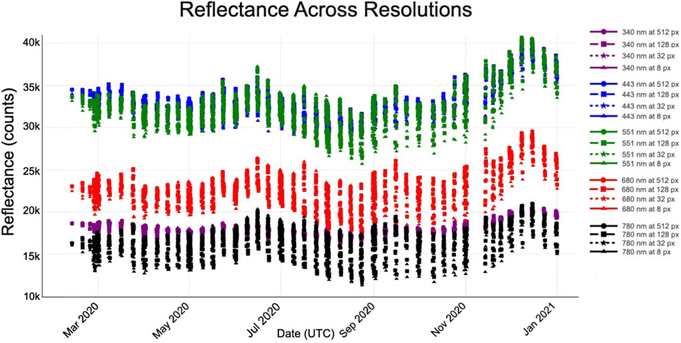 Figure 3 presents the reflectance time series in multiple spectral bands for selected days in 2020. The daily amplitude (vertical variability) mostly reflects the changing land–ocean composition within each scene, while each wavelength also exhibits its own seasonal cycle. To illustrate the impact of spatial aggregation, we show results at four resolutions: 512 px, 128 px, 32 px, and 8 px.