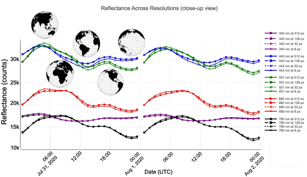 Figure 4 provides a close-up comparison of the globally integrated reflectances on two summer days. Across every wavelength, the various pixel resolutions yield virtually identical values, with only the 8px line differing by less than 1%. As Earth rotates, EPIC samples change surface characteristics, which in turn alters both the intensity and spectral composition of the reflected radiation field. As seen in the figure, this natural temporal modulation of the radiation measurements is by far more impactful than the resolution effects.