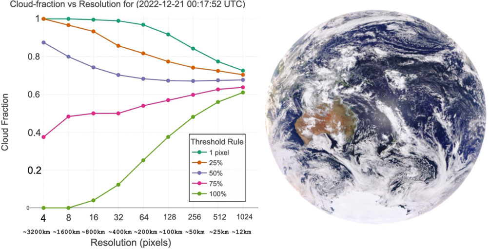 To simulate coarser resolutions, we down-sampled each cropped image to eight target sizes (1,024, 512, … , 8 pixels per side, or ∼12, 25, 50, 100, 200, 400, 800, 1,600 km, respectively). We define a “superpixel” as a contiguous N × N block of original image pixels aggregated into one lower-resolution cell. For our reflectance bands, we preserved the dominant spectral features by averaging the valid pixels within each superpixel, retaining that mean value only when more than 50% of its constituent pixels contained valid data. For the cloud fraction binary mask, we implemented five distinct threshold rules that designate a superpixel as “cloudy” if at least one pixel is cloudy, more than 25% of the pixels are cloudy, or ≥50%, ≥75%, or 100% - all the pixels of its constituent high-resolution pixels are cloudy. This allowed us to explore the sensitivity of cloud-fraction estimates to different sub-pixel classification assumptions. We then computed “cloud fraction” as the ratio of cloudy to total valid pixels for each combination of observation, resolution, and threshold rule.