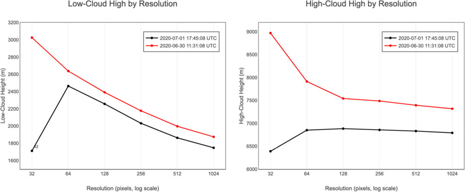 Figure 7. Cloud-effective height for two EPIC images of the same day as a function of spatial resolution with a 50% threshold rule. The EPIC field of view at 17 UTC captures the Americas in the center of the image, while 11 a.m. is dominated by Africa (see Figure 3). Left: low-cloud heights; right: high-cloud heights. The x-axis shows superpixel size (32–1,024 px), and the y-axis gives cloud height in meters. Scaling properties change drastically at 64 pixels (∼200 km per pixel).