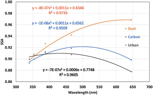 Figure 1. Near-UV to visible spectral dependence of SSA for the three major aerosol types (dust, carbonaceous aerosols, and urban-industrial) representing JJA period for Sahara, Sahel, and all urban location average deduced from the work of Kayetha et al. (2022). The derived coefficients of polynomials for the respective aerosol types are included in the plot.