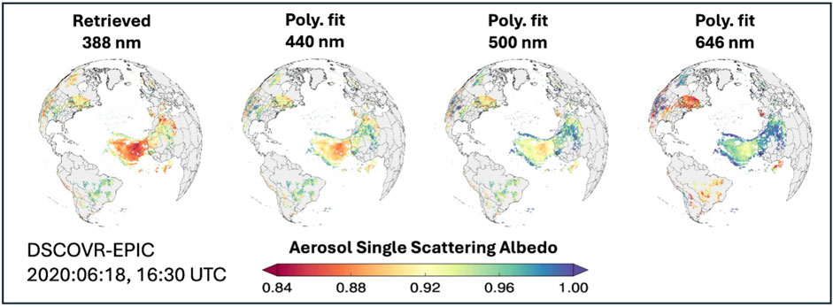 An important upgrade to the current EPICAERUV algorithm is the conversion of retrieved 388 nm SSA to 354, 440, 500, and 646 nm. The conversion is carried out using a quadratic fit approach pivoted to the retrieved SSA at 388 nm to report the spectral SSA at the listed additional wavelengths. The quadratic fit approach relies on a research data set developed using long-term AERONET-OMI-MODIS synergy observations to derive SSA at the UV (OMI) and visible (MODIS) wavelengths independently without any prior assumptions on the spectral dependence of aerosol absorption (Kayetha et al., 2022). To capture the variability in aerosol absorption, the research dataset was first categorized, based on 110 globally distributed AERONET sites, into three prevalence aerosol type environments of carbonaceous aerosols, mineral dust, and urban-industrial. The identified regions with the seasonal presence of carbonaceous aerosols include Sahel, Southern Africa, Middle East, Eastern China, Northern India, Australia, United States, and South America. Those for the mineral dust aerosol types include Sahara, Middle East, Eastern China, and Northern India. The urban-industrial aerosols are represented with an averaged spectral SSA model derived from all urban locations considered in the study. The spectral SSA polynomials for areas outside these pre-defined regions are represented with the default models for the three respective aerosol types, i.e., USA-South America averaged polynomials for carbonaceous smoke, Saharan desert spectral SSA for dust, and all urban location average for the urban-industrial aerosol types. The polynomial coefficients are then used to estimate the aerosol SSA at 354, 388, 440, 500 and 646 nm following an offset adjustment (retrieved minus estimated SSA) based upon the SSA retrieval at the reference wavelength of 388 nm. Figure 1 shows the polynomial expressions derived for the Sahel region for carbonaceous, mineral dust for Saharan desert, and averaged urban-industrial aerosols during the JJA period. Figure 2 displays example maps of the retrieved SSA at 388 nm from near-UV aerosol algorithm on 18 June 2020 (16:30 UTC) and reported spectral SSA at 440, 500, and 646 nm using the quadratic fit approach.