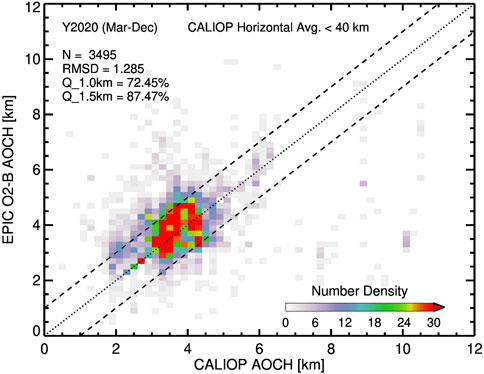 Figure 3. Global comparison of AOCH retrieved by EPIC Oxygen-B band and that calculated from CALIOP observations. The spacetime collocated dataset collected for the period March through December 2020 are used. RMSD: root-mean-square-difference, Q_1.0 km and Q_1.5 km are the percentage of total matchups contained within ±1.0 km and ±1.5 km agreement.