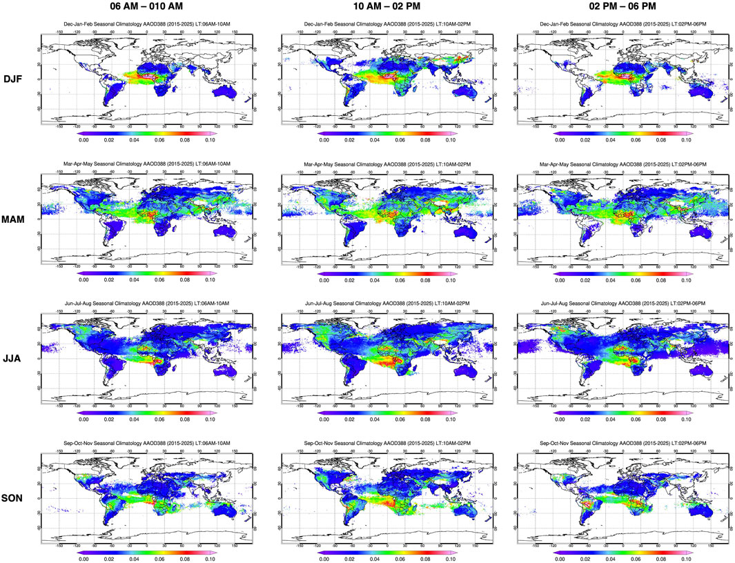 Figure 4 shows global maps of 10-year seasonal averages of EPIC-retrieved all-sky AAOD at 388 nm. The AAOD data was further averaged over three 4-h time windows representative of local morning (6 a.m.–10 a.m., left panel), late morning to early afternoon (10 a.m.-2 p.m., center) and afternoon (2 p.m.–6 p.m.) prevailing meteorological conditions. The AAOD maps are shown for four northern hemisphere seasons, i.e., winter (December-January-February, first row), spring (March-April-May: 2nd row), summer (June-July-August: 3rd row), and fall (September-October-November: 4th row). A brief description of obtained climatological maps is presented here.