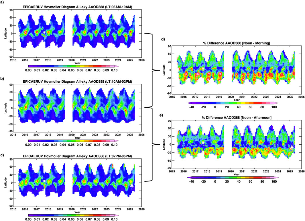 Figure 5. Hovmöller diagrams of the EPICAERUV all-sky AAOD retrieved at 388 nm for the three different local time frames, i.e., (a) 6 a.m.-10a.m., (b) 10 a.m.-2 p.m., and (c) 2p.m.-6 p.m. The AAOD data were gridded to 0.25° by 0.25° and longitudinally averaged for each latitude grid. Only good-quality (Quality Flag = ’0′) retrievals were used. The percent difference in AAOD at 388 nm between the around-noon and morning, and around-noon and afternoon time windows are shown in (d) and (e), respectively.