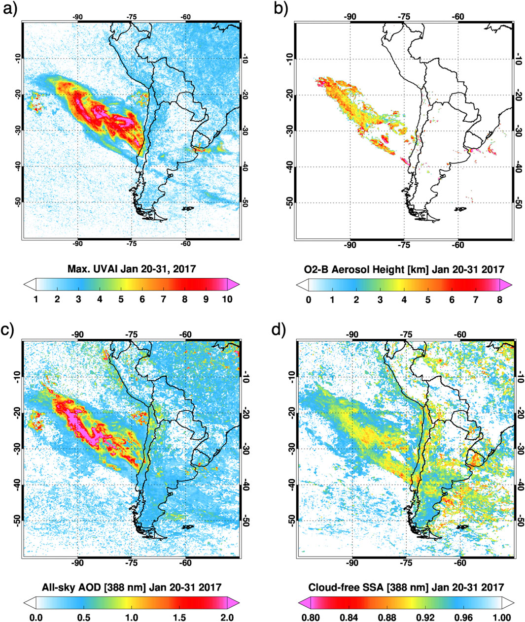 Figure 7. (a) All-sky maximum UVAI, (b) cloud-free averaged O2-B aerosol height, (c) all-sky AOD at 388 nm, and (d) cloud-free SSA at 388 nm for the Chilean wildfire event observed during January 20–31, 2017. Maps of the latter three parameters represent the good-quality (Quality Flag = ′0′), UVAI-weighted quantities for the corresponding period. The EPICAERUV retrievals were mapped to 0.1° by 0.1° uniform grids.