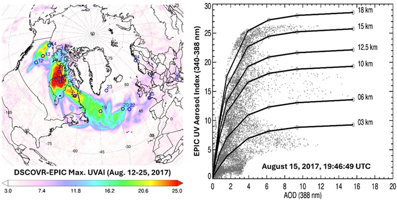 Figure 8-left shows the spatial extent of the smoke plume in terms of maximum UVAI from EPIC observations over a 2-week period in August 2017. Figure 8-right shows the retrieved 388-nm AOD (x-axis) and observed UVAI (y-axis) on 15 August 2017, at 19:46:49 UTC over the area shown in Figure 8-left. In this demonstration retrieval, the SSA was fixed at 0.900 and AOD and ALH were derived. Also shown is the calculated relationship between ALH (between 3 km and 18 km) and UVAI. These results show the overall spatial distribution of ALH over the analysis area, indicating three distinct aerosol layer heights at about 2 km, 8 km and 16 km. AOD values as high as about 12 are observed at the lowest and highest levels, whereas a few cases of even larger AOD’s are reported between 6 km and 10 km. A detailed investigation of the August 2017 British Columbia wildfires and resulting PyroCb event in terms of the EPIC aerosol retrievals and stratospheric mass estimation is described in Torres et al. (2020).