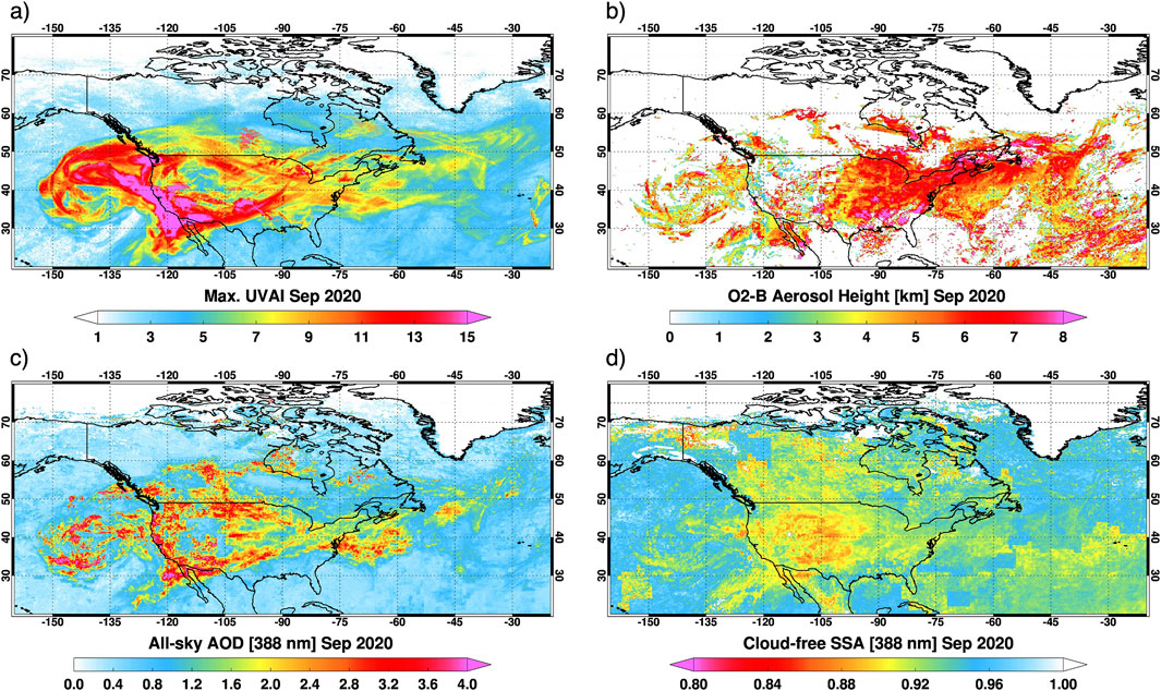 Figure 9. (a) All-sky maximum UVAI, (b) cloud-free averaged O2-B aerosol height, (c) all-sky AOD at 388 nm, and (d) cloud-free SSA at 388 nm for the September 2020 United States west coast wildfire events.