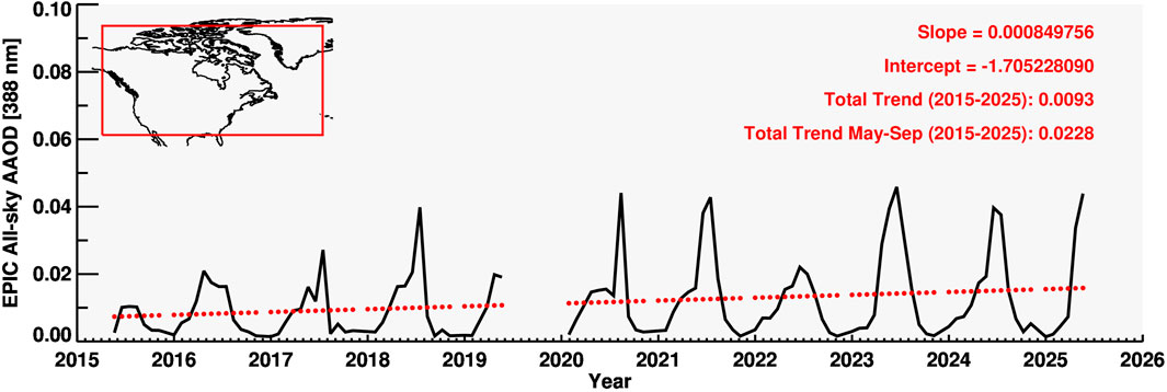 Figure 10. Sampling-weighted, monthly regional time series of EPIC all-sky AAOD (388 nm) representative of North America and adjacent oceans. The red dotted line represents a linear regression trend calculated from the entire EPIC aerosol record. Total trend values on top-right are the total change in AAOD over the period 2015–2025 and that calculated considering the peak burning months of May through September.