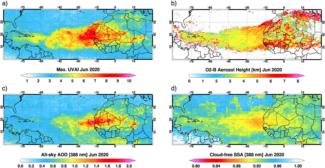 Figure 11. (a) All-sky maximum UVAI, (b) cloud-free averaged O2-B aerosol height, (c) all-sky AOD at 388 nm, and (d) cloud-free SSA at 388 nm for the June 2020 Saharan ‘Godzilla’ dust transport event.