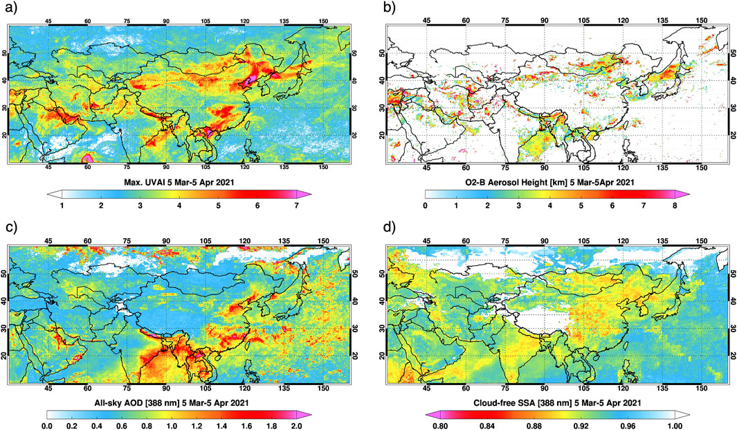 Figure 12. (a) All-sky maximum UVAI, (b) cloud-free averaged O2-B aerosol height, (c) all-sky AOD at 388 nm, and (d) cloud-free SSA at 388 nm for the March-April 2021 Asian dust and smoke events.