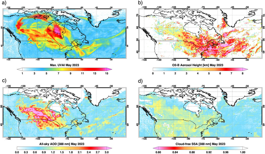 Figure 13. (a) All-sky maximum UVAI, (b) cloud-free averaged O2-B aerosol height, (c) all-sky AOD at 388 nm, and (d) cloud-free SSA at 388 nm for the May 2023 Canadian wildfire events.