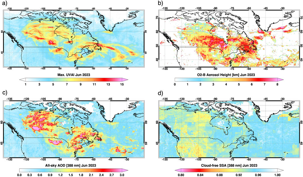 Figure 14. (a) All-sky maximum UVAI, (b) cloud-free averaged O2-B aerosol height, (c) all-sky AOD at 388 nm, and (d) cloud-free SSA at 388 nm for the June 2023 continued Canadian wildfire events.