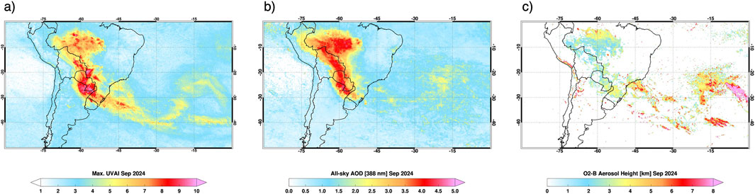 Figure 15. (a) All-sky maximum UVAI, (b) all-sky AOD at 388 nm, and (c) cloud-free averaged O2-B aerosol height for the September 2024 biomass burning season in South America.