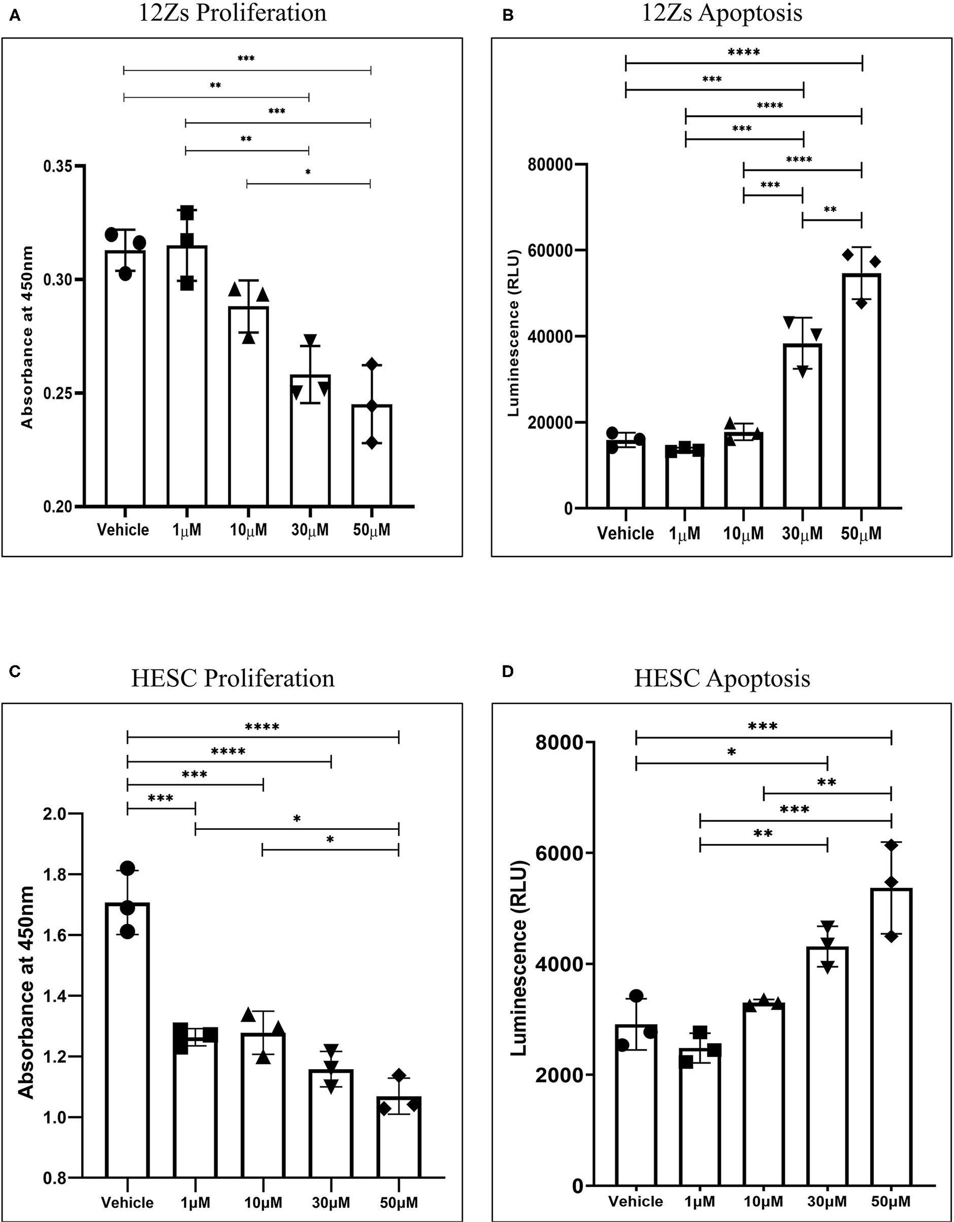 Figure 1. Stimulation of CB1 and CB2 receptors in endometriotic epithelial cells (12Z) and endometrial stromal cells (HESC) attenuates proliferation by triggering apoptosis. (A) Treatment with various concentrations of WIN 55 leads to attenuation of proliferation in a dose-dependent manner. (B) Caspase 3/7 activity in the cell supernatant showed that WIN 55 exposure triggered apoptosis in 12Z cells. (C) WIN 55 exposure in HESC cells showed concentration-dependent reduction in proliferation with WIN 55 concentration as low as 1 μM. (D) Apoptosis in HESC cells exposed to WIN 55 showed a similar dose-dependent increase in caspase 3/7 activity as observed in 12Z cells. Ordinary one-way ANOVA with Tukey post-hoc. *P < 0.05 **P < 0.01 ***P < 0.001 ****P < 0.0001.