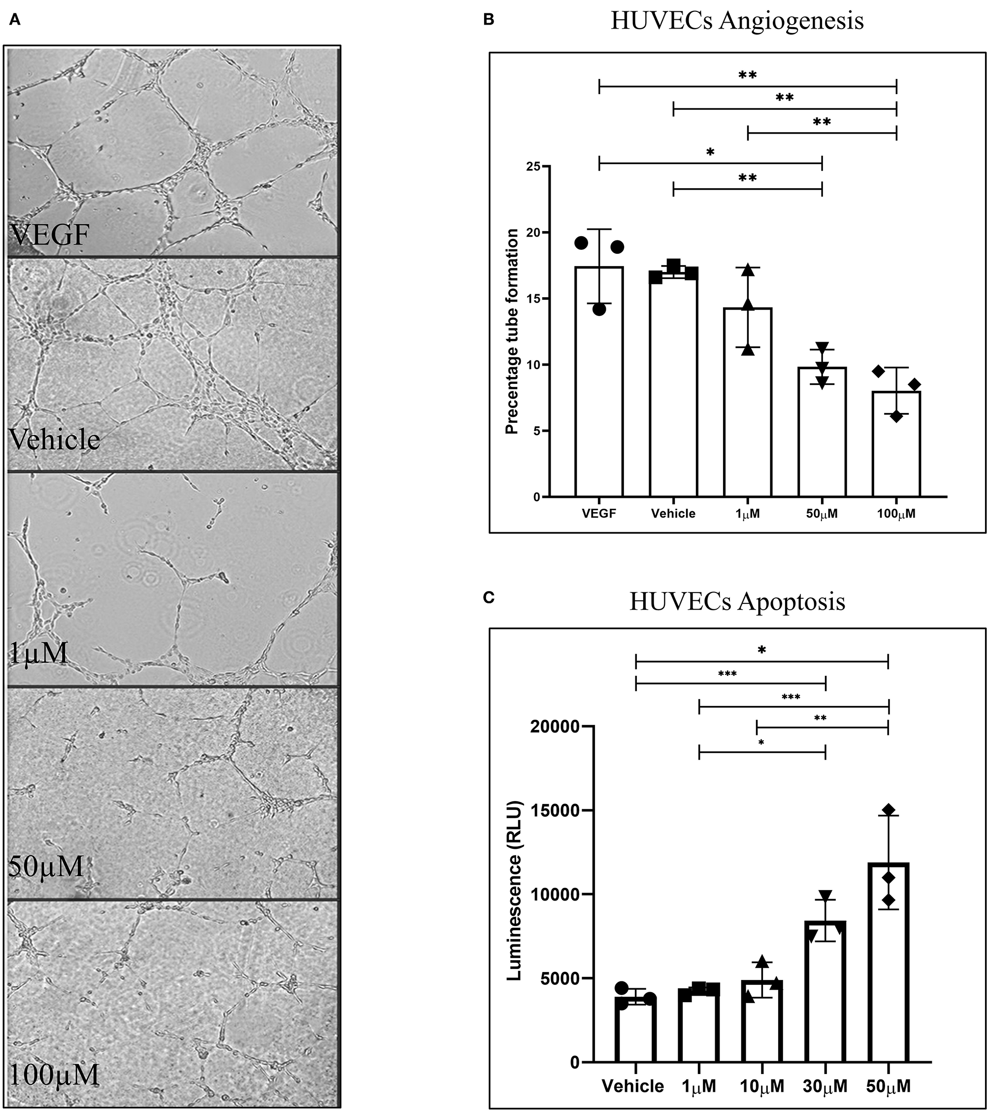 Figure 2. WIN 55 exposure inhibits tube formation ability in human umbilical vein endothelial cells (HUVECs). (A) Images captured shows alteration of tube formation in concentrations as low as 1 μM and near complete reduction in high doses. (B) The percentage of tube formation analysis showed a statistical significance across the board with a dose-dependent behavior. (C) Treatment with various doses of WIN 55 leads to dose-dependent increase in caspase activity in HUVECs. Ordinary one-way ANOVA with Tukey post-hoc. *P < 0.05 **P < 0.01 ***P < 0.001.