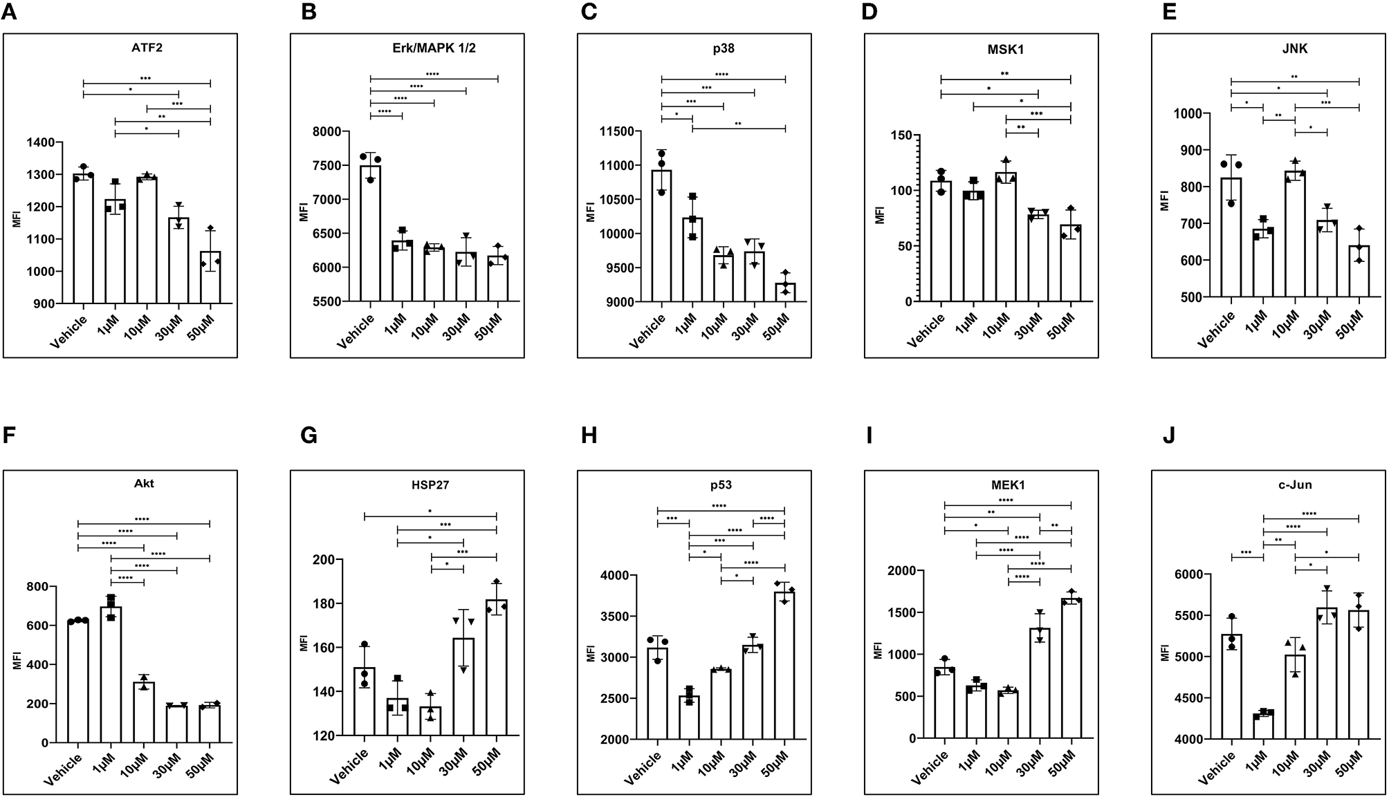 We have evaluated the activity of MAPK family kinases and Akt in 12Z cells exposed to WIN 55 using a multiplex kinase assay kit. MAPK family proteins such as ATF2 (Figure 3A), Erk 1/2 (Figure 3B), p38 (Figure 3C), MSK1 (Figure 3D), and JNK (Figure 3E) showed a significant reduction in the mean fluorescence intensity, suggesting reduced levels in 12Z cells exposed to various doses of WIN 55 compared with a vehicle. Whereas proteins involved in signal relay to cells and back, such as HSP27 (Figure 3G), p53 (Figure 3H), and MEK1, (Figure 3I) were found to be significantly higher in the 12Z cells treated with WIN 55 compared to a vehicle. In addition, total Akt in the 12Z cells treated with WIN 55 also showed a significant reduction in MFI when compared with vehicle (Figure 3F). Although a positive trend was observed, no significant differences in MFI of c-JUN analytes were observed, except 1 μM concentration, in WIN55-treated cells compared with vehicle (Figure 3J).