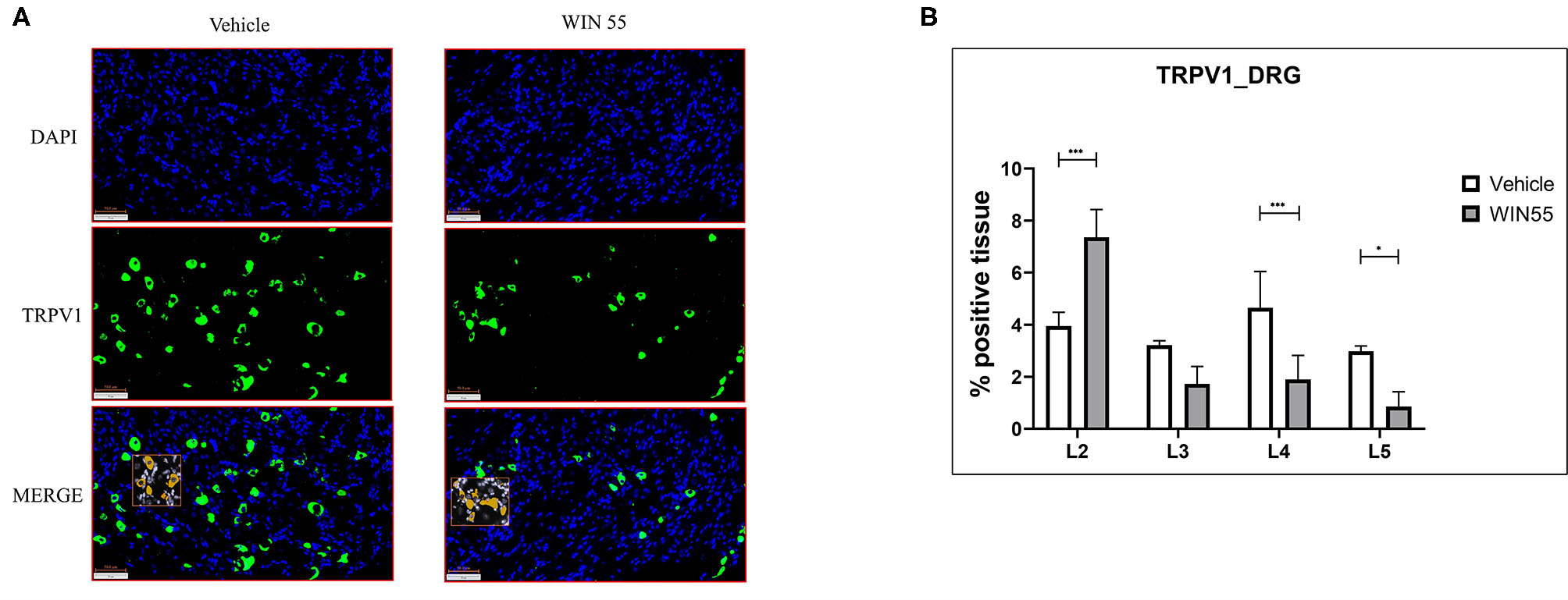 Figure 5. Cannabinoid receptor stimulation alters TRPV1 expression in the dorsal root ganglia of mice with endometriosis. Lumbar region DRG from L1 to L5 were analyzed for TRPV1 expression through immunofluorescence. (A) Representative images of blue (DAPI positive) and green (TRPV1 positive) channel and merged (DAPI and TRPV1 positive) layers show TRPV1 expression in DRG isolated from both vehicle and WIN 55 treated animals. (B) Statistical analysis of TRPV1 expression showed increased abundance in L2 of DRG isolated from WIN 55 treated mice, whereas L4 and L5 DRG showed significantly reduced expression when compared with mice treated with vehicle. The orange box within the immunofluorescence images represents the analysis used in this study. Scale bar 100 μm. Ordinary two-way ANOVA with Sidak post-hoc. *P < 0.05 ***P < 0.001.