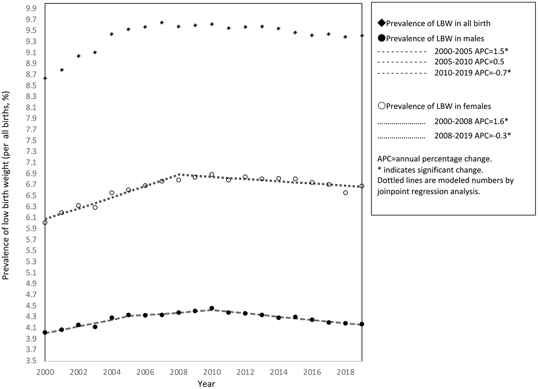 Trends in the prevalence of LBW from 2000 to 2019 were analyzed using joinpoint regression analysis. This method connects several different line segments, thus allowing for succinct characterization of changes in a trend over time (10). The Joinpoint Regression Program version 4.6.0.0 software was provided by the Surveillance Research Program of the National Cancer Institute. Tests for fit in a maximum of four joinpoints (11). In this study, joinpoint regression analysis was used to identify years (as the independent variable) in which significant changes in prevalence rate occurred over the study period, and amount of change as the annual percentage change in rate per year. We allowed up to four joinpoints and identified any difference from no change in each segment, with values of p < 0.05 considered statistically significant. Stata for Mac version 15 (Stata Corp, College Station, Texas, USA) was used for all other statistical analyses.
