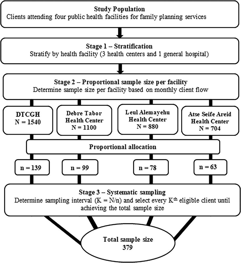 In the first stage, the participants were stratified by health facility on the assumption of relative homogeneity among the clients within each facility. In the second stage, proportional allocation was used to determine the number of participants per facility based on the monthly client flow for family planning services. Out of a total of 4,224 clients, the calculated sample size of 379 was proportionally distributed as follows: DTCSH (N = 1,540): n = 139; Debre Tabor Health Center (N = 1,100): n = 99; Leul Alemayehu Health Center (N = 880): n = 78; Atse Seife Areid Health Center (N = 704): n = 63.