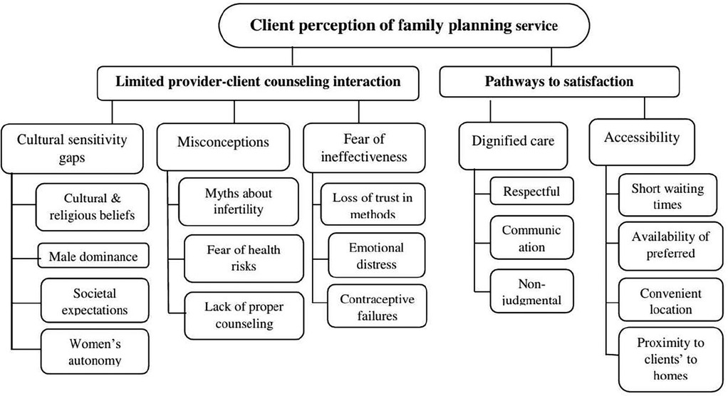 Two themes were identified from the participants' in-depth interviews. Theme 1 reviews “limited provider-client counseling interaction,” which was subcategorized into “cultural sensitivity gaps,” “misconceptions,” and “fear of ineffectiveness.” Theme 2 addresses “Pathways to satisfaction,” which was subcategorized into “dignified care” and “accessibility” (Figure 3).