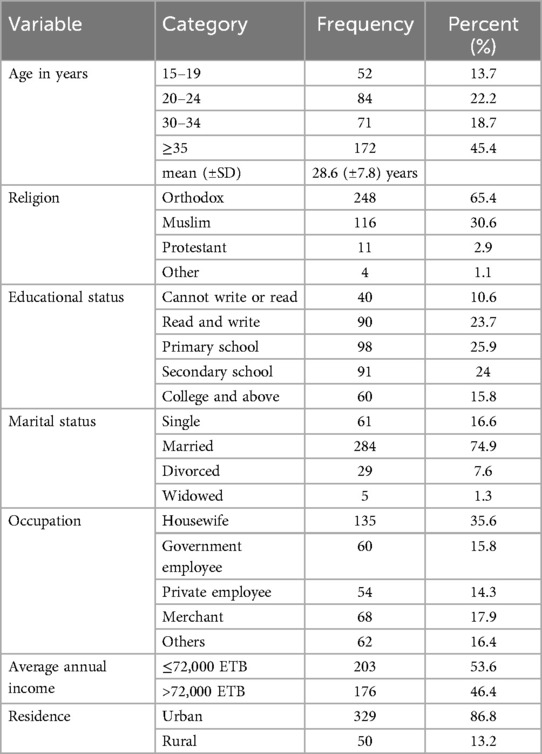 A total of 379 family planning service users were approached for an interview. The mean (±SD) age of respondents was 28.6 (±7.8) years. Of the respondents, 172 (45.4%) were aged 35 years or older, and 284 (74.9%) were married. The majority, 248 (65.4%), of family planning users were Orthodox Christian by religion. Regarding educational status, 130 (34.3%) of respondents had no formal education, while the majority, 249 (65.7%), had formal education. The majority of respondents, 329 (86.8%), were urban residents. Among the participants, 135 (35.6%) were housewives, and 203 (53.6%) reported at least 72,000 ETB per year (Table 1).
