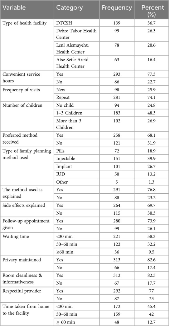 Concerning method use explanation, 291 (76.8%) of respondents confirmed that the provider explained how to use the method, and 264 (69.7%) reported that potential side effects were explained for their chosen method. Additionally, 280 (73.9%) of the respondents reported that the provider offered a follow-up appointment if they encountered any problems with the method. Regarding waiting times, 221 (58.3%) of respondents waited less than 30 minutes for services, and a high proportion of respondents, 312 (82.6%), confirmed that their privacy was maintained during the procedure. Furthermore, 312 (82.3%) of respondents received their preferred method, and 292 (77%) experienced a respective provider during their visit. Finally, the distance from respondents' homes to the health facility was measured. A large portion, 172 (45.4%), of respondents lived within 30 minutes of the health facility, 159 (42%) lived 30–60 minutes away, and 48 (12.7%) lived more than 60 minutes away from the facility (Table 2).