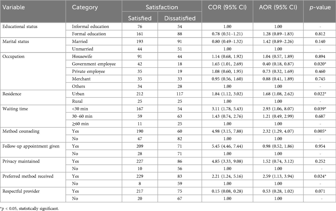 In the bivariate analysis, variables significantly associated with client satisfaction included educational status, marital status, occupation, residence, waiting time, method of counseling, follow-up appointment given, privacy maintained, preferred method received, and respectful provider.