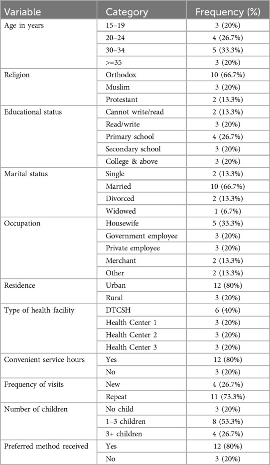 The majority of participants were aged 30–34 years, 5 (33.3%), and identified as Orthodox, 10 (66.7%). Most had completed primary school 4 (26.7%) and were married 10 (66.7%). Regarding occupation, the largest group was housewives, 5 (33.3%), with the majority residing in urban areas, 12 (80%). In terms of healthcare access, 6 (40%) participants visited DTCSH, 12 (80%) of participants reported convenient service hours, and 11 (73.3%) were repeat visitors. Most of the participants had 1–3 children 8 (53.3%), and 12 (80%) received their preferred family planning method (Table 4).