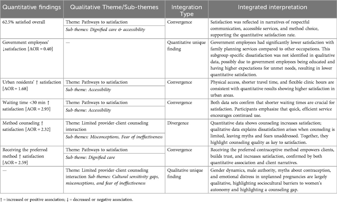The integration of quantitative and qualitative data revealed several convergent findings, which mutually enhanced the understanding of family planning satisfaction. Quantitative analysis showed that 62.5% of clients were satisfied with the services, and this satisfaction was significantly associated with urban residence, shorter waiting times, and preferred method received. These findings were echoed in the qualitative sub-themes of accessibility and dignified care, in which respectful communication, client empowerment, and autonomy were emphasized. Notably, a divergence emerged: the quantitative findings showed a positive association between method counseling and client satisfaction, whereas the qualitative insights identified dissatisfaction with counseling—marked by insufficient detail, unresolved misconceptions, and unmet informational needs.
