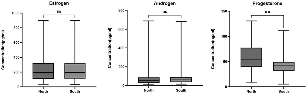 Results: Generally, average serum levels of estrogen, androgen, and progesterone were 195.5 (29.2–899.2.0) pg/ml, 60.7 (8.2–687.3) pg/ml, 46.0 (5.2–130.6) ng/ml respectively. When categorized by location, serum estrogen level was 195.8 (35.7–899.2) pg/ml in the north compared to 195.3 (29.2–899.2) pg/ml, in the south, p = 0.63. Androgen was 52.8 (8.2–687.3) pg/ml vs. 61.2 (16.0–683.33) pg/ml, p = 0.81, and progesterone level was 53.3 (9.2–130.6) ng/ml vs. 43.0 (5.2–111.3) ng/ml, p = 0.0019. Northern participants whose mothers did not have any formal education had higher androgen (p = 0.009) and estrogen (p = 0.0012) levels compared to those from the south. Also, girls with educated fathers had higher progesterone levels (p = 0.03). The proportion of parental unemployment was low across locations. Other covariates did not influence hormonal levels (p > 0.05).